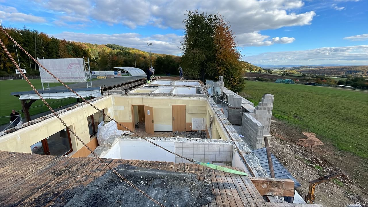 Es geht voran. Am Samstag hat das Sportheim sein Dach verloren und wird jetzt bis ca. Mitte November „oben ohne“ sein.